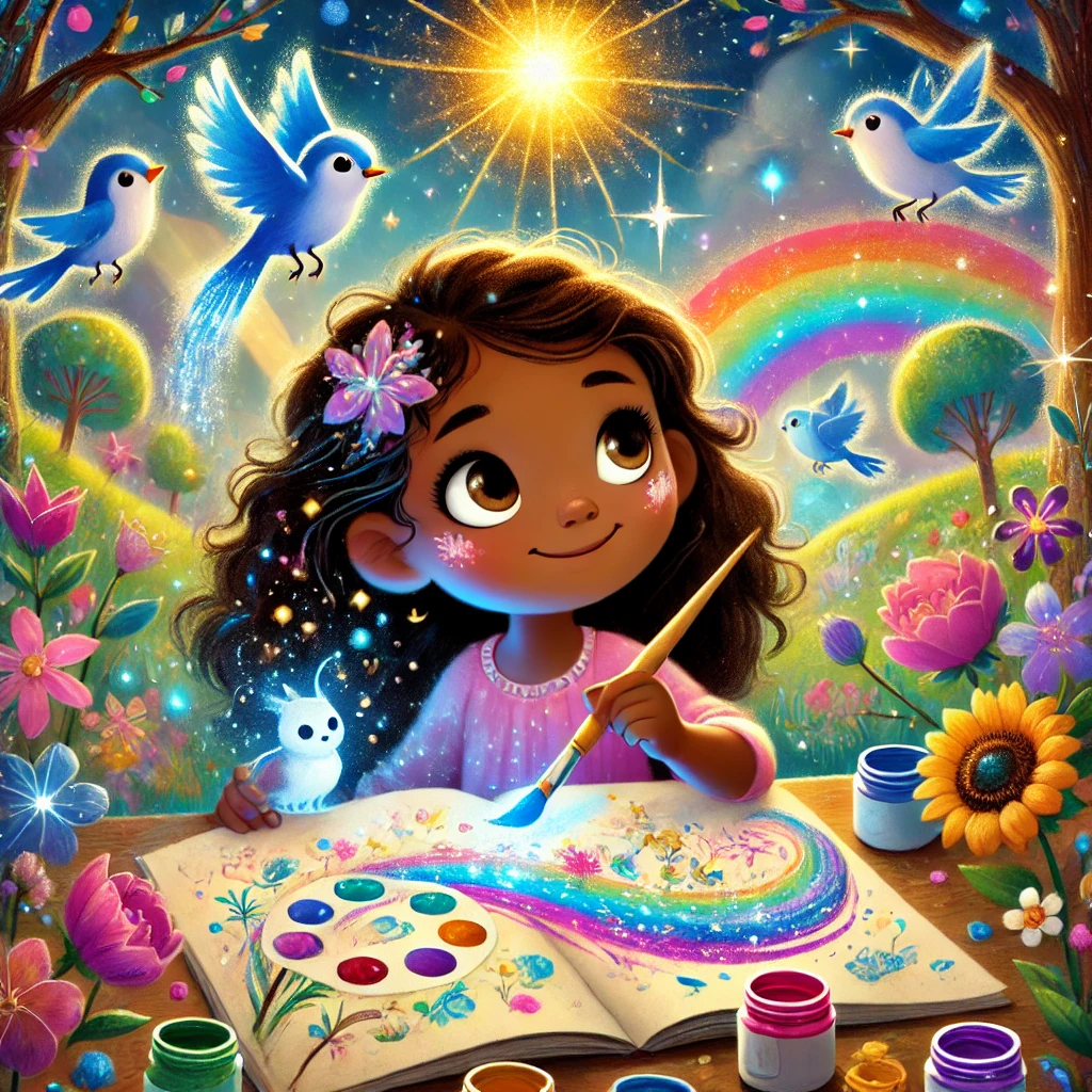 Kiki painted a tree with bright green leaves, and it grew right out of her paper, filling the room with a soft breeze. She painted a golden sun, and the room lit up as if it were outside.